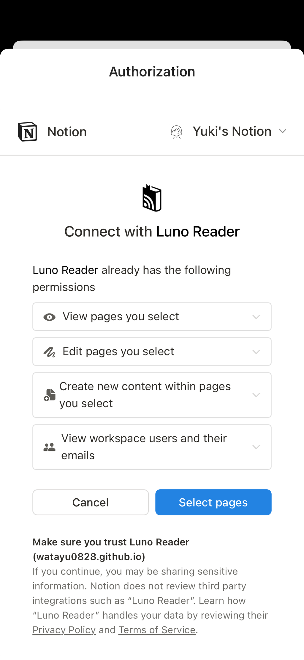 Notion の認証画面が表示されるので、連携させるページを選択します。